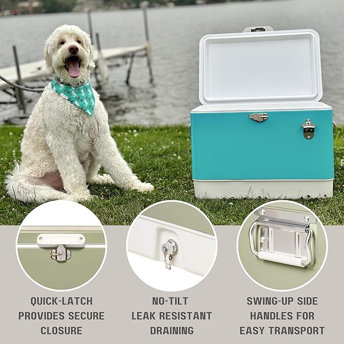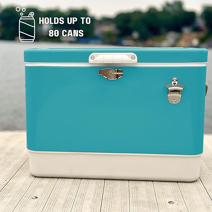 - TIMELESS STYLE: Featuring a two-tone aqua blue and cream design, this hard-sided cooler adds a touch of retro charm to your outings. Elevate your outdoor experience with a metal cooler that not only performs but also looks good doing it.