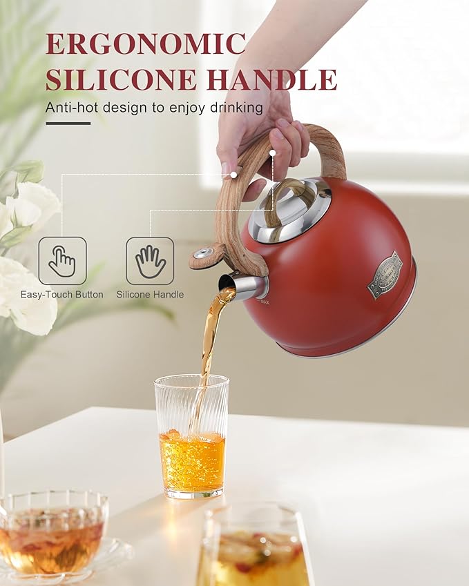 - Heat-Resistant Silicone Handle Design : The silicone coated handle on stovetop kettle is effectively insulated, the ergonomic shape and design adds comfort for pouring and filling, and there is a simple button on the handle so you can easily turn the nozzle on and off.