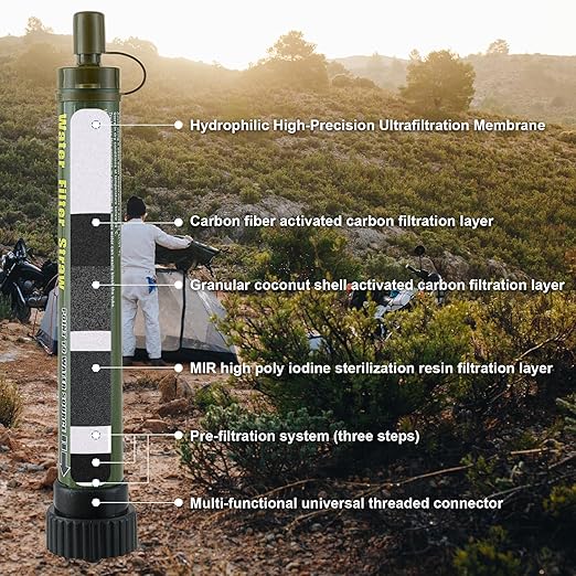 Water Filter Straw Kit Outdoor Portable Personal Water Filter Straw Water Purifier Survival Gear and Equipment for Hiking Camping Travel Army Green