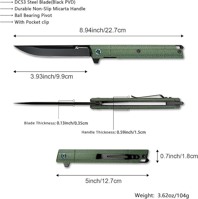 Pocket Folding Knife,Flipper Open,DC53 Steel Blade and Micarta Handle. With pocket clip and glass breaker,Sharp Camping Hiking Daily Work Knives,Everyday Carry EDC tool Knife