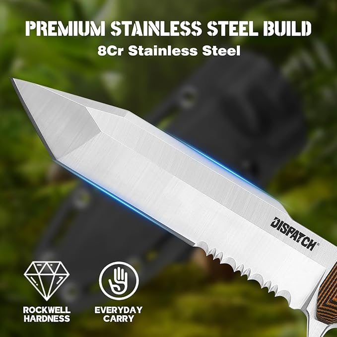 - SERRATED TANTO BLADE: Brushed surface treatment on blade can hides scratches that appear over time.The fixed tanto blade is thick and sturdy, provides excellent piercing ability and durability, partially serrated blade are great for a variety of cutting tasks