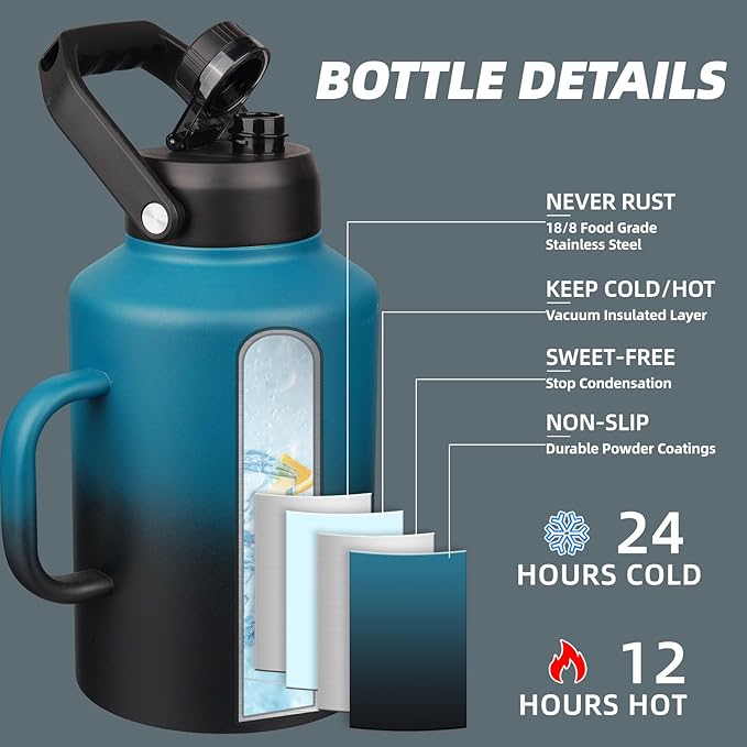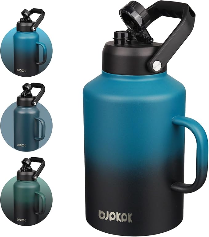 - INSULATED WATER BOTTLE: BJPKPK gallon water bottle use double-walled vacuum insulation technology to keep your beverage cold for up to 24 hours, or hot for up to 12 hours, make sure you enjoy your favorite beverages at the most suitable temperature all day.