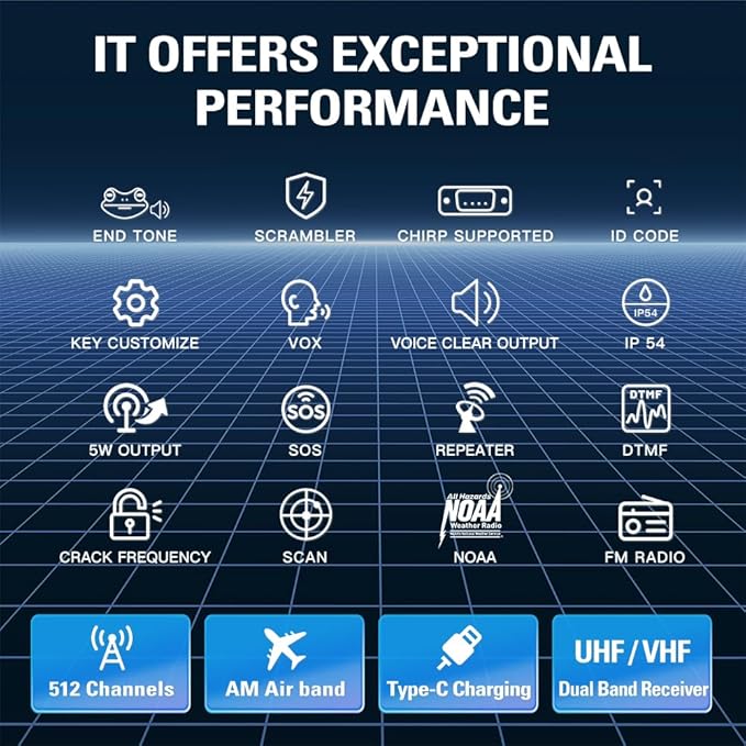 - All You Need Are Included: 1 X A36SE GMRS Radio Handheld/ 1 X 1500mAh Type-C Battery/ 1 X 805 Short Antenna/ 1 X 15.12inch 771 AM Antenna(120/300MHZ)/ 1 X Earpiece/ /1 X Desk Charger/ 1 X USB-C Charger & cable/ 1 X K-Port Cable/ 1 X Back Clip/ 1 X User Manual/ 1 X Lanyard