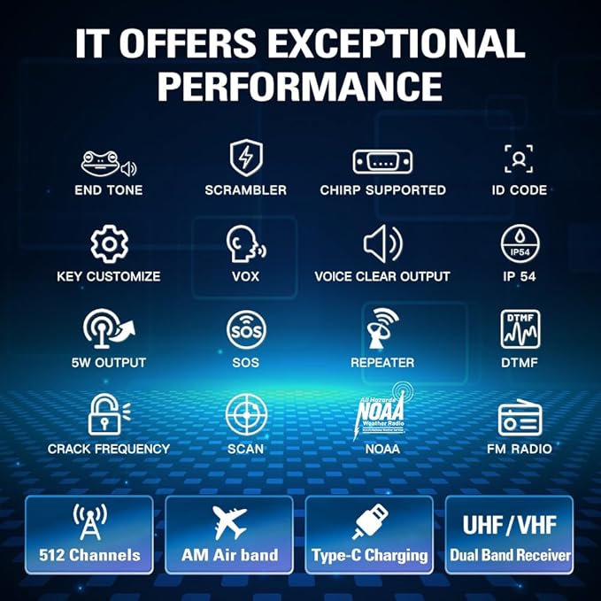 - All You Need Are Included: 1 X A36SE GMRS Radio Handheld/ 1 X 1500mAh Type-C Battery/ 1 X 805 Short Antenna/ 1 X 15.12inch 771 AM Antenna(120/300MHZ)/ 1 X Earpiece/ /1 X Desk Charger/ 1 X USB-C Charger & cable/ 1 X K-Port Cable/ 1 X Back Clip/ 1 X User Manual/ 1 X Lanyard