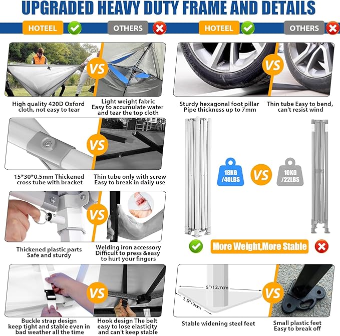 - 🏆【Packing List & Warranty Service】1xPop Up Canopy Frame, 1x 10x10 Canopy Top Cover, 4xSilver-coated Panels (2xWindows and 2xDoors with Zipper), 8xGround Nails, 4xWind Ropes, 1x Portable Bag, 1x Manual. We provide warranty service, if you have any questions with Hoteel pop up tent 10x10, please feel free to contact us. We will solve it for you immediately.