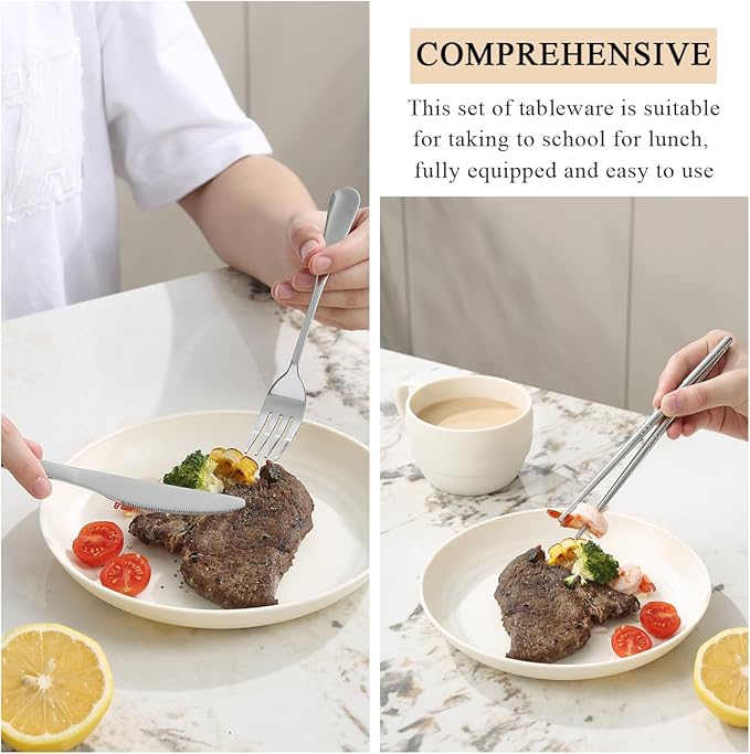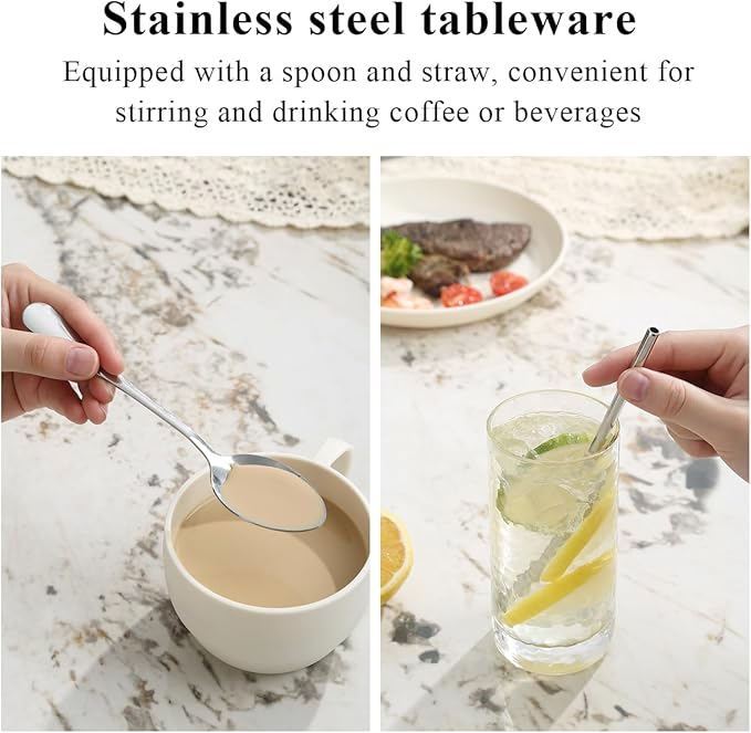 - Portable Travel Cutlery Set Includes: 1 white plates, 1 white coffee mug, 1 straight straw, and 1 set of stainless steel cutlery, the cutlery includes knive, fork, spoon and chopsticks. You will receive a beautifully complete set!