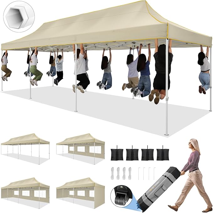 HOTEEL 10x30 Pop up Canopy Tent for Parties, Heavy Duty Easy Setup Tent with 5 Sidewalls, Outdoor Commercial Instant Gazebo for Wedding Event, with Roller Bag & Sand Bags, Khaki(Hexagonal Frame)
