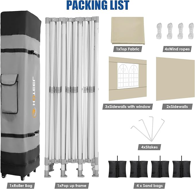 - 🏆【Packing List & Warranty Service】1xPop Up Canopy Frame, 1x 10x30 Canopy Top Cover, 5xPVC-coated Panels(3 sidewalls with window), 4xSandbags, 4xGround Nails, 4xWind Ropes, 1x Roller Bag, 1x Manual. We provide warranty service, if you have any questions with Hoteel pop up tent 10x30, please feel free to contact us. We will solve it for you immediately.