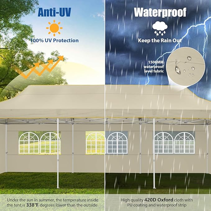 - 🏆【Upgrade 5 Removable Sidewalls】Our 10x30 commercial canopy come with 5 removable sidewalls(3 sidewalls with window). 210D polyester with PU lining, which is 100% waterproof and able to block 99% UV sun rays.Elegance church windows design provide you more brightness and excellent scenery outside. Also, you could DIY the sidewalls to meet your different needs. With the help of Hook-and-loop fastener straps, sidewalls are easy to install and remove.