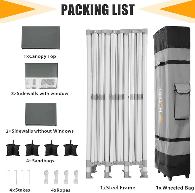 - PACKING LIST & EASY SETUP: 1 x Pop Up Canopy Frame, 1 x Canopy Top Cover, 5 x PU Coated Panels (3 x Windows and 2 x Panels), 4 x Sandbags, 4 x Ground Nails, 4 x Wind Ropes, 1 x Wheeled Bag, 1 x Manual, 2 x Screws, 1 x Repair Tape. Simply take the fully assembled frame out of the bag, place the top canopy over it, stretch legs and done