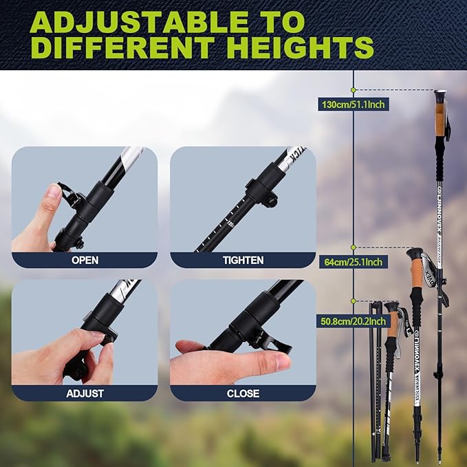 - Adjustable: Adjust to your ideal height in seconds, ranging from 51.1” at full length to 25.1” when fully collapsed. They even double as hiking poles for kids!