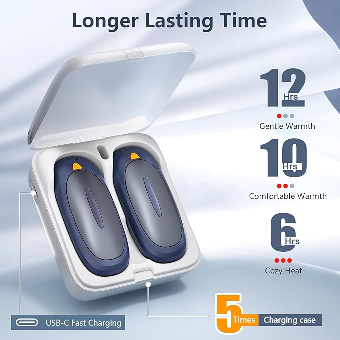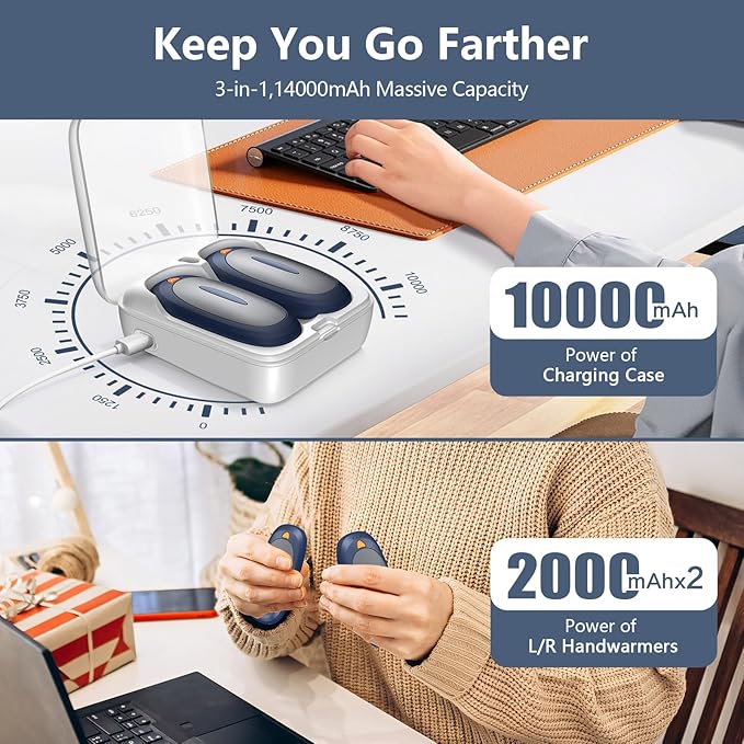 - 【3-in-1 Convenient Hand Warmers】: Each 2000mAh hand warmer comes with a 10000mAh charging case, allowing multiple recharges for extended use. It makes recharging on the go a breeze.