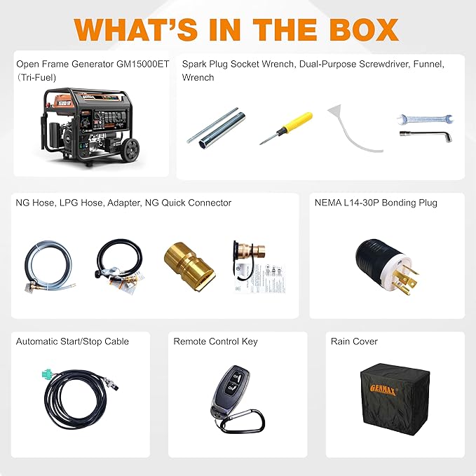 - Included Components : Automatic START/STOP Cable (1) NG Hose (1) LPG Hose (1), Dual-Purpose Screwdriver (1) Oil Funnel (1), NEMA L14-30P Bonding Plug (1) NG Quick Connector (1), Remote Control Key (1) NG Air Intake Connector (1), Spark Plug Socket Wrench (1) Wrench (2) Rain Cover (1) Automatic START/STOP Cable (1) NG Hose (1) LPG Hose (1), Dual-Purpose Screwdriver (1) Oil Funnel (1), NEMA L14-30P Bonding Plug (1) NG Quick Connector (1), Remote Control Key (1) NG Air In… See more
