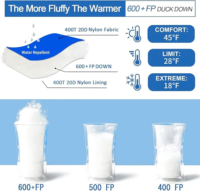 - Keep Warm: Backpacking sleeping bag Filled with 1.7lbs 600 FP premium duck down, comfort temperature 28°F- 45°F, limit 18°F. Double zipper design prevents cold air, added chest insulation for better warmth
