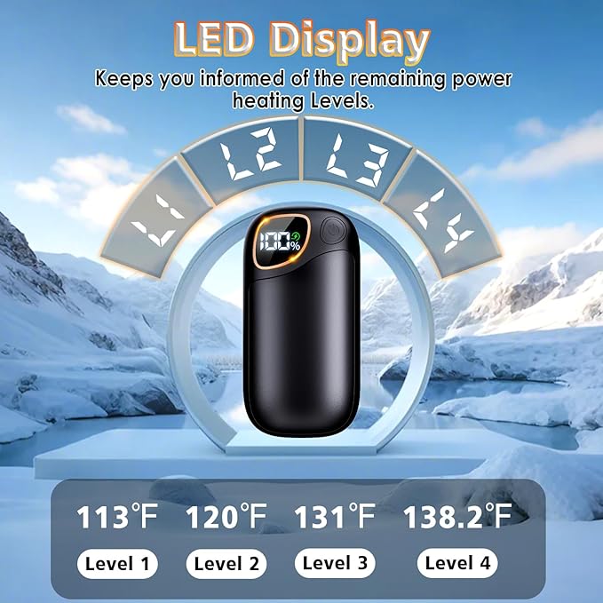 - 【 Rechargeable Hand Warmer with LED Display 】 Unlike ordinary electric hand warmers rechargeable on the market, our hand warmer features a high-clarity led display that not only shows the heating level but also displays the real-time battery level, no more low-battery anxiety. Great for women, men, camping, traveling, sports, ball game, hunting, golf, fishing, hiking, skiing, etc.