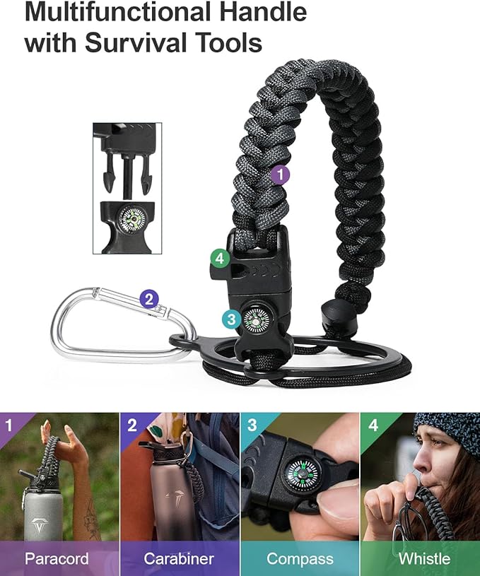 - Ready for adventures: Topre 40oz water bottles includes paracord handle is crafted from sturdy braided rope with an attached survival kit. This includes a compass, a whistle, and a clip, making it an ideal companion for any outdoor activity — be it camping,hiking or exploring new places through travelling.