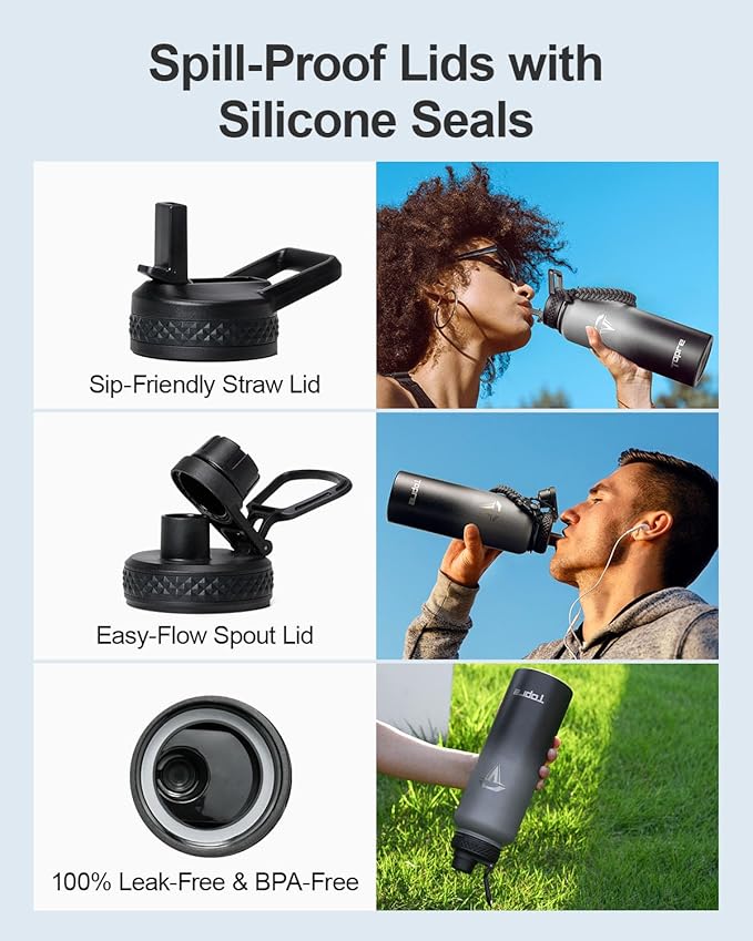 - 100% Leak-Proof: Topre 40 oz stainless steel water bottles includes two lids—a straw lid and a spout lid. Both are equipped with silicone rings to prevent any spills or leaks, and are completely BPA-free for your peace of mind.