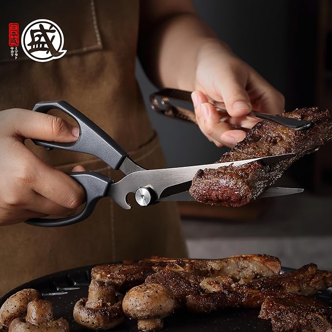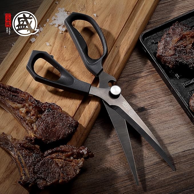 - Versatile Utility Scissors: The joints of the blades are cleverly designed as a bottle opener, which makes it easy to open beers and other beverages. Suitable for cutting steaks, grilled meat, vegetables, pasta and pizza etc