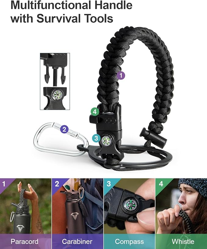 - Ready for adventures: Topre 40oz water bottles includes paracord handle is crafted from sturdy braided rope with an attached survival kit. This includes a compass, a whistle, and a clip, making it an ideal companion for any outdoor activity — be it camping,hiking or exploring new places through travelling.