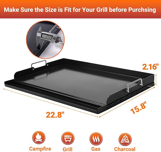 - Versatile Cooking Made Easy: From fluffy pancakes to sizzling steaks, this griddle for gas grill is versatile enough to handle breakfast, lunch, and dinner. You can cook pancakes, bacon, sandwich, eggs, salmon, burgers, sausages, vegetables, including teppanyaki style foods and more.