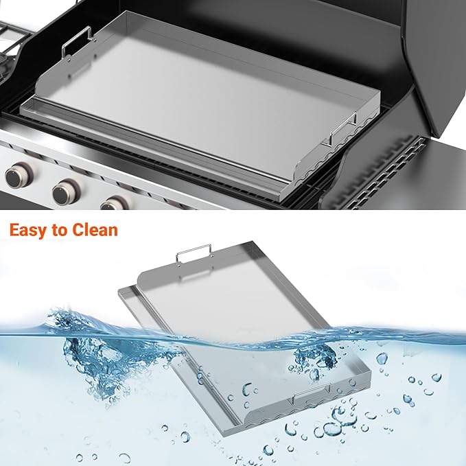 - Premium Stainless Steel Construction: The universal stainless steel griddle is made from extra-thick, heavy-duty stainless steel for easy cleaning. (Ensure to season before use to prevent sticking)