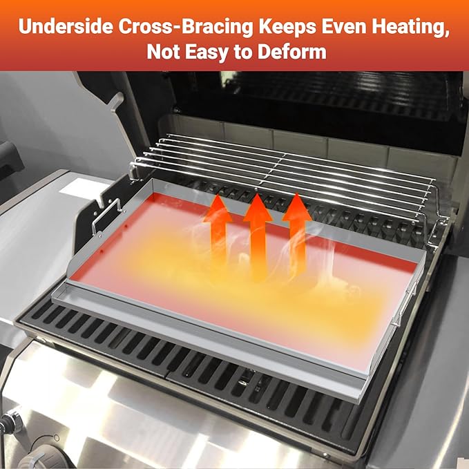 - Even Heat Distribution: The even heat grill griddle designs with cross bracing for consistent heating and to prevent warping. The BBQ griddle perfect for charcoal and gas grills.(Not suitable for direct open flame stoves)