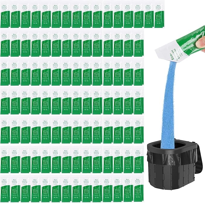 - Emergency Preparedness - You May need something like this for your emergency toilet. Perfect for no access to modern conveniences. d to your camping poop bag/camping shower bag to work with biodegradable waste bag and portable foldable toilet.Biodegradable Portable Toilet Absorbent Gel is also suitable for portable toilet for tailgating, RV toilet treatment, travel toilet, portable potty, camp toilet or portable toilet for home use. Avoid confusion , no need to waste water to clean the toilet