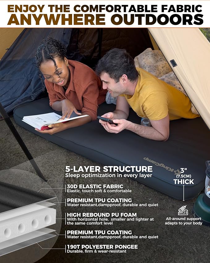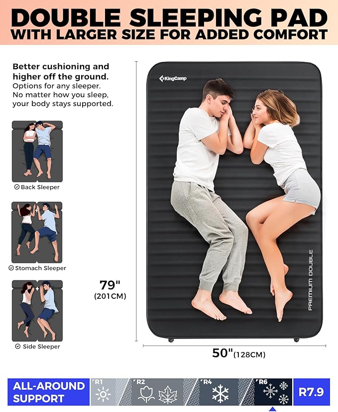 - SELF-INFLATING DOUBLE SLEEPING PAD – Crafted as a spacious double camping mattress (128cm wide) for 2 people to share cozy nights outdoors, this black self inflating camping mattress features an 7.5 R-Value to lock in warmth year-round. Its 7.5cm thick memory foam core shields you from jagged rocks and uneven ground, delivering hotel-like comfort.