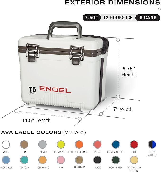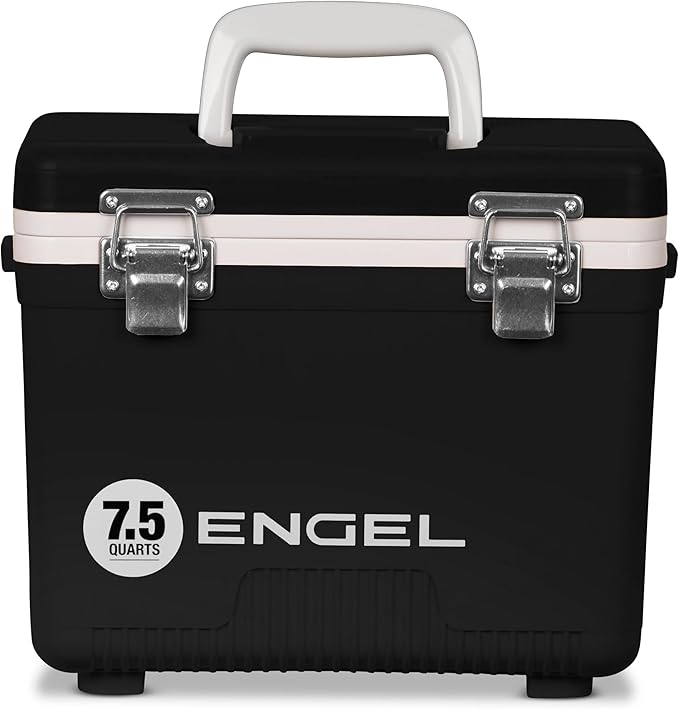 - ENGEL HARD SHELL DRYBOX COOLER: Stainless Steel industrial strength latches and hinged lid for quick and access to food and drinks; Keeps ice for up to two days and holds up to 8 cans with a 2:1 ratio of ice to cans