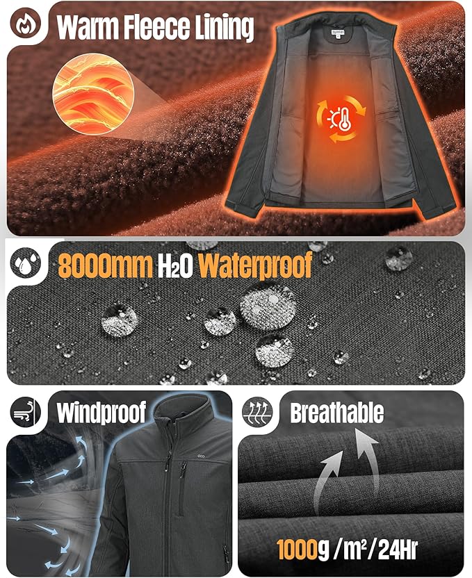 33,000ft Men's Waterproof Softshell Jacket Warm Fleece Lined Windbreaker Lightweight Soft Shell for Travel Hiking Golf