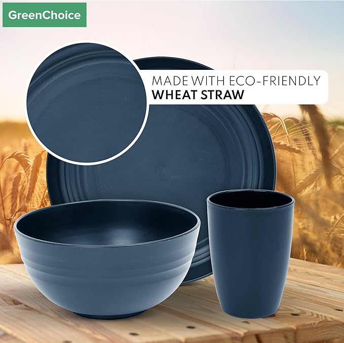 Wheat Straw Dinnerware Sets for 4 - GreenChoice Lightweight & Unbreakable Dishes Microwave & Dishwasher Safe Perfect for Camping, Picnic, RV, Dorm Plates, Cups and Bowls (Blue)