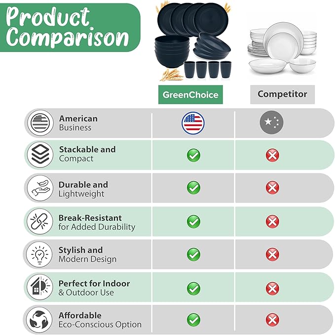 - ECO-FRIENDLY & SAFE: Made with natural wheat straw fiber, our dinnerware set is 100% BPA-free and non-toxic, ensuring a safe dining experience for all ages