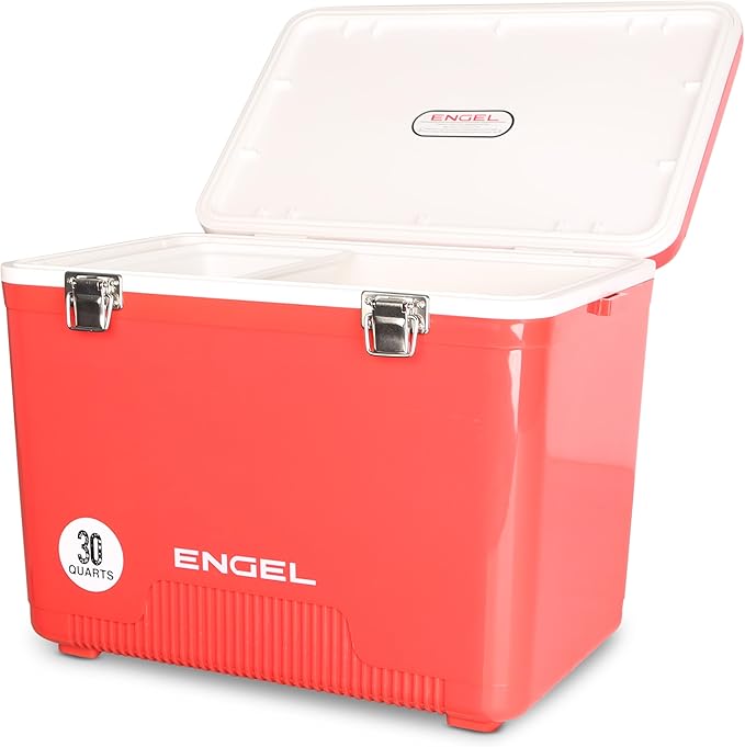 - ENGEL HARD SHELL DRYBOX FISHING COOLER: Stainless Steel industrial strength latches and hinged lid for quick and access to food and drinks; Keeps ice for up to two days and holds up to 45 cans with a 2:1 ratio of ice to cans.