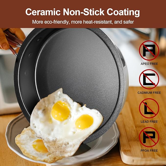 - Ceramic Non-Stick Coating - The frying pan in this cookware set features a ceramic non-stick coating that is safe and non-toxic, ensuring no more burnt food. Please read the included product care card carefully before use.