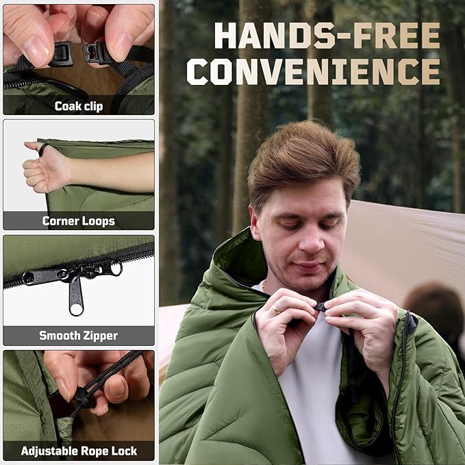 - Versatile Design: Transform this multifunctional blanket into a quilt, poncho, temporary sleeping bag, or mat. An adjustable drawstring creates a footbox for personalized warmth and breathability, while four corner loops secure it to the ground—perfect for picnics. Adapt it to your needs, whether camping, hiking, or relaxing at home