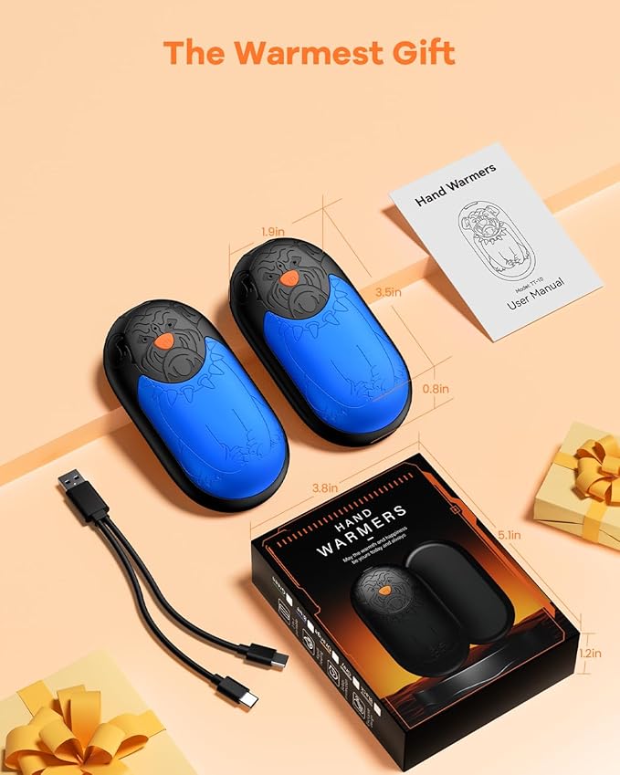 - 【All Day Warmth】 Our rechargeable hand warmers have built-in high-efficiency rechargeable, providing you with all-day warmth (different heating levels/ambient temperature, heating time is different). The included 2-in-1 Type-C charging cable allows the hand warmers to be fully charged within 4 hours, keeping your warmth always online (Double-Click Hand Warmer's Power Button: 3 blue indicator lights keep you informed of the remaining battery)