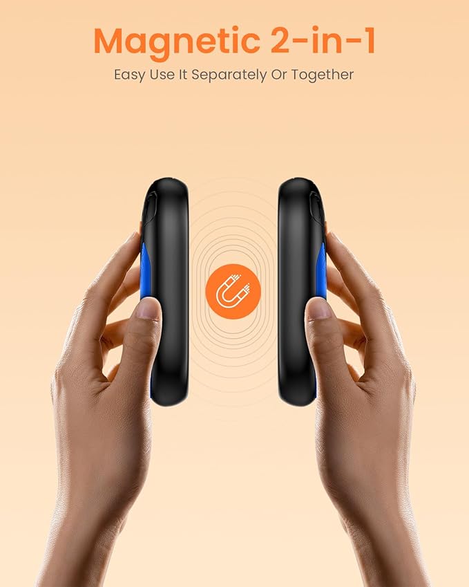 - 【2-in-1 Electric Hand Warmer】 AJVV hand warmers rechargeable come with a magnetic feature that you can put them together to make a double-sided heating hand warmer, you can also use it separately, one for each hand, or share your warmth with your friends, family, and loved ones. The portable pocket design is suitable for camping, skiing, hunting, fishing, golf, walking a dog, watching football and baseball, and various activities (Together Size: 1.9x3.5x1.6in; Separate size: 1.9x3.5x0.8in )