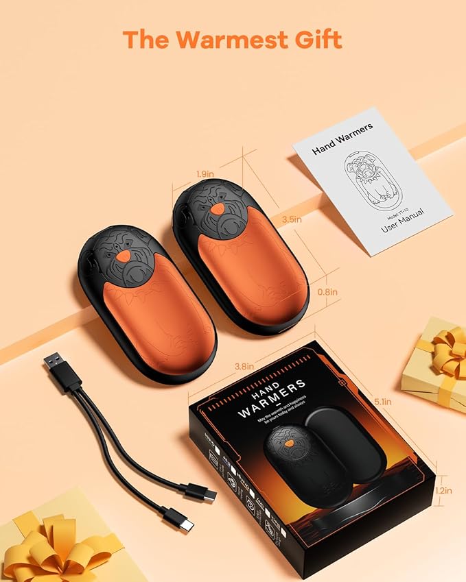 - 【All Day Warmth】 Our rechargeable hand warmers have built-in high-efficiency rechargeable 8000mAh battery (2x4000mAh), providing you with all-day warmth (different heating levels/ambient temperature, heating time is different). The included 2-in-1 Type-C charging cable allows the hand warmers to be fully charged within 4 hours, keeping your warmth always online (Double-Click Hand Warmer's Power Button: 3 blue indicator lights keep you informed of the remaining battery)