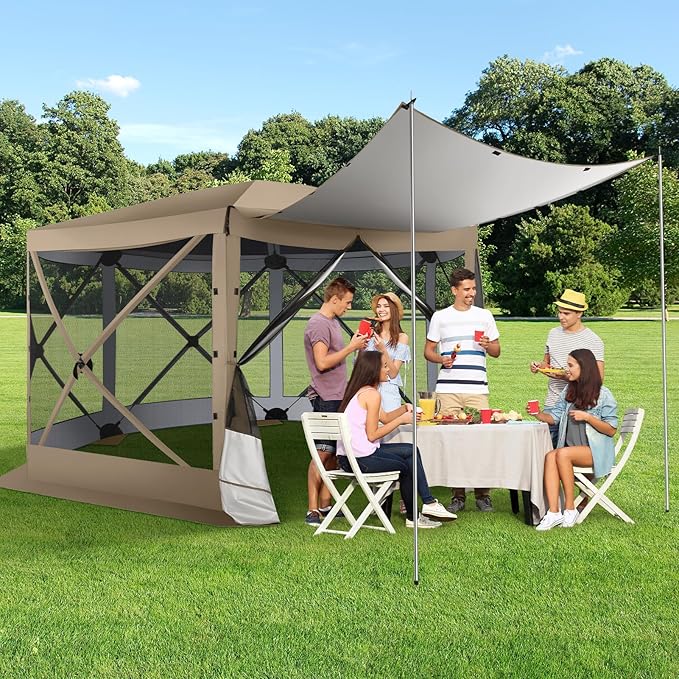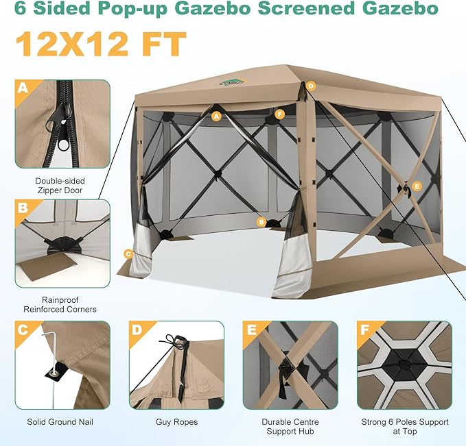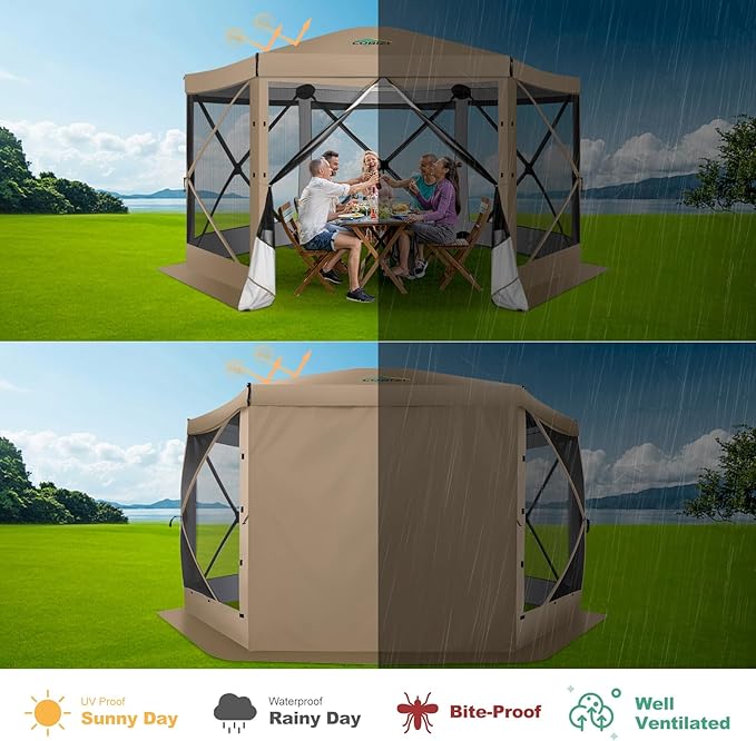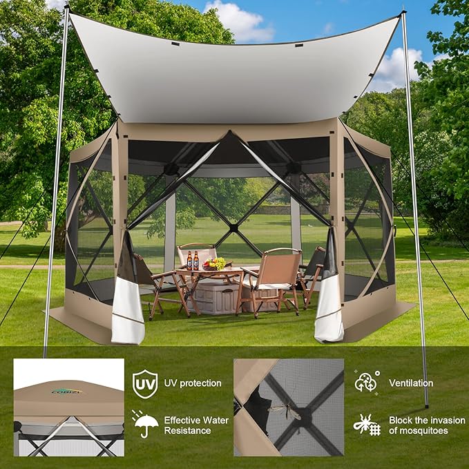 COBIZI 12x12 Pop up Gazebo Screen House Tent for Camping, Outdoor Canopy with Removable Roof&Mosquito Netting, Portable Hub with Carrying Bag and Ground Stakes, Khaki