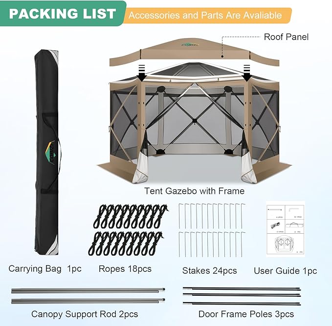 - ✅【Comprehensive Packing List & Warranty】 Your purchase includes 1 Tent Gazebo with Frame, 1 Upgraded Carrying Bag, 3 Door Frame Poles, 24 Stakes, 18 Ropes, 2 canopy support rods and a User Guide. If any accessories are missing or damaged, please contact our customer service for prompt replacement. Note please: Upon first opening, the screen tent may appear inside out. This is intentional for compact storage. Do not attempt to reverse it, as it may cause damage to the gazebo.