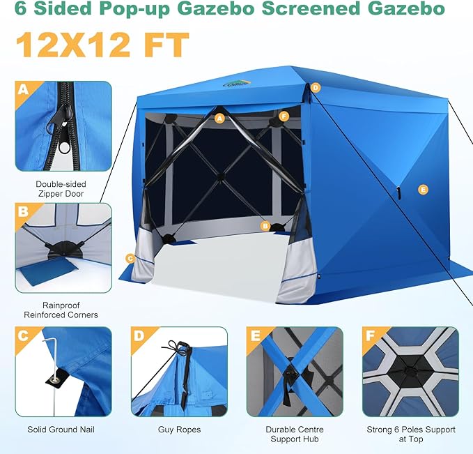 COBIZI 12x12 Pop up Gazebo Screen House Tent for Camping, Outdoor Canopy Tent with Removable Roof&Sidewalls, Portable Hub Tent with Carrying Bag and Ground Stakes, Blue(Upgraded 2.0)