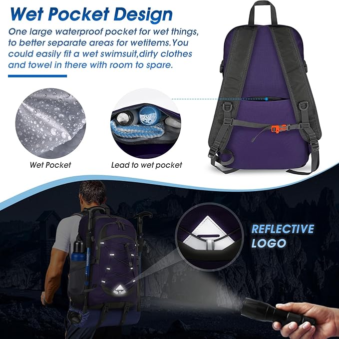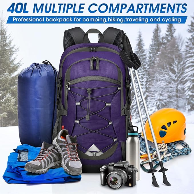 • 【Large Capacity&Multi Compartment】This portable hiking backpack has 40 liters of storage space with a multi-compartment design that includes 1 main zipper compartment, 2 zipper front pockets, 2 side pockets, and a waterproof wet pocket. The pen pocket and slip pockets in the front can help you organize your items more easily. The large capacity backpack helps you to easily storage all your essentials for your outing.