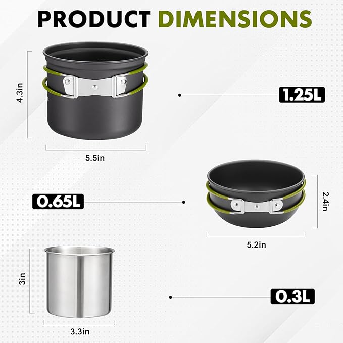 - Durable and Lightweight - With hard anodized aluminum and stainless steel construction, the camping set are the perfect balance of lightweight and long lasting outdoor cookware.
