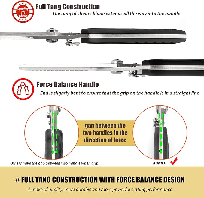 - Full Tang Construction - As a mark of quality, the tang of shears blade extends all the way into the handle, it is sandwiched between two pieces of safety food grade ABS plastic and fastened on either side with three metallic rivets. This structure is more durable and more powerful cutting performance.