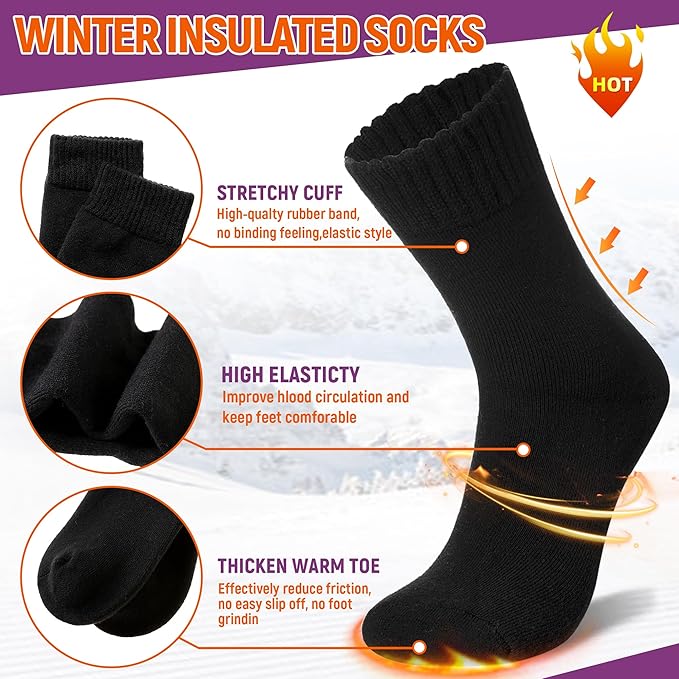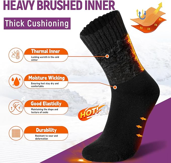 - Designed for Extreme Temperatures: Extra warm for harsh winter weather, these heavily brushed fuzzy-lined insulated thermal socks offer softness and comfort for your feet during extended outdoor activities in cold conditions. They are ideal for anyone who works outdoors, enjoys skiing, or loves hiking and camping in the mountains during winter.