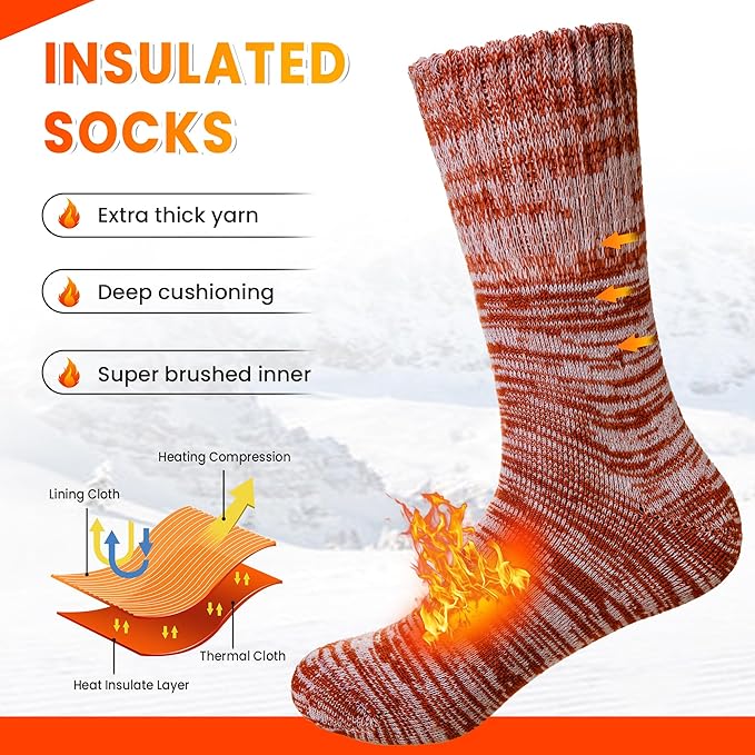 - 【Thickened Construction】Extra warm for the extreme cold weather during the winter. Heavily brushed fuzzy warm lining make these insulated thermal socks provide soft and comfort for your feet during extended outdoor trail cold weather.The heated socks are ideal for you if you work outdoors, if you go skiing or if you enjoy hiking and camping in the mountains during the winter.