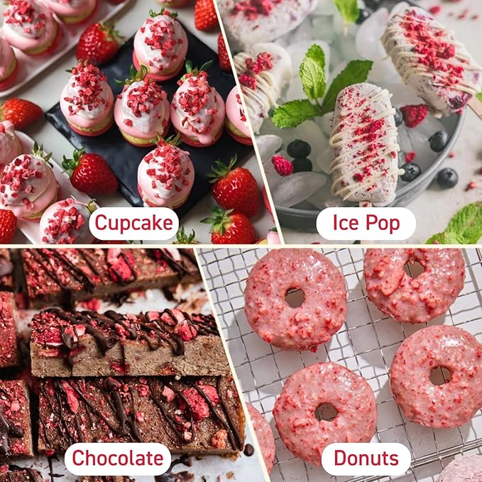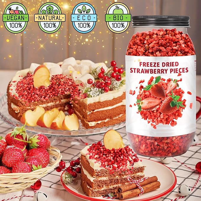 - Ideal for Baking and Cooking: These versatile freeze-dried strawberry pieces are perfect for infusing your baked goods, like muffins, cakes, and breads, with a burst of natural fruit flavor. For best baking results, we recommend using them as decorative toppings after baking, as direct baking may cause burning and affect the taste