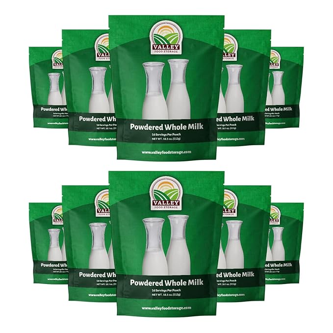 Valley Food Storage Whole Milk Powder | Contains Vitamin A & Vitamin D | Powdered Milk Long Term Storage, 25 Year Shelf Life | Camping Food, Backpacking Meals, Prepper Supplies (10 Bags + Bucket)