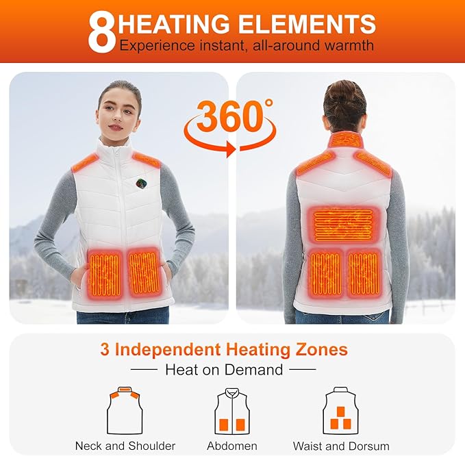 - INSTANT WARMTH & LIGHTWEIGHT - 8 ultra-slim carbon fiber heating elements of heated vest women quickly generate even and continuous heat at the neck, shoulders, abdomen (under two pockets), back and waist, ensuring your body core and hands are warm and comfortable without wearing heavy clothes.Come and try this womens heated vest,you will feel unprecedented warmth and lightness
