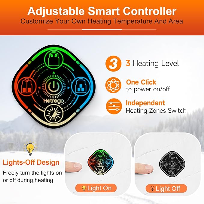 - Upgraded 5-in-1 smart controller - our heated vest for women rechargeable, equipped with 3 heating levels (149°F-131°F-113°F) and 3 independent control zones (neck and shoulders, abdomen, back and waist), allowing you to customize your warmth for any weather or environment; Simple operation, one-touch to enjoy your unique warmth with our warming vest for women heated ; Unique light-off design allows you to perfectly blend into any environment, whether it is outdoors or daily work